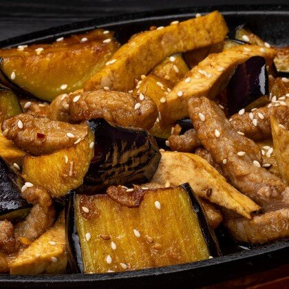 Говядина с баклажанами, стрелками чеснока под оригинальным соусом